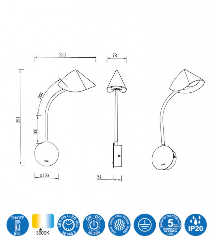 LUMINARIAS: Led integrado 7,5w 3000k 660lm. Con interruptor