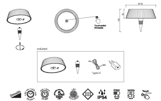 Recargable mediante USB incluido, tiempo de recarga 4-6h, duración 5-12h.