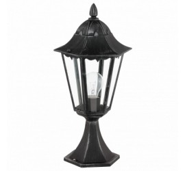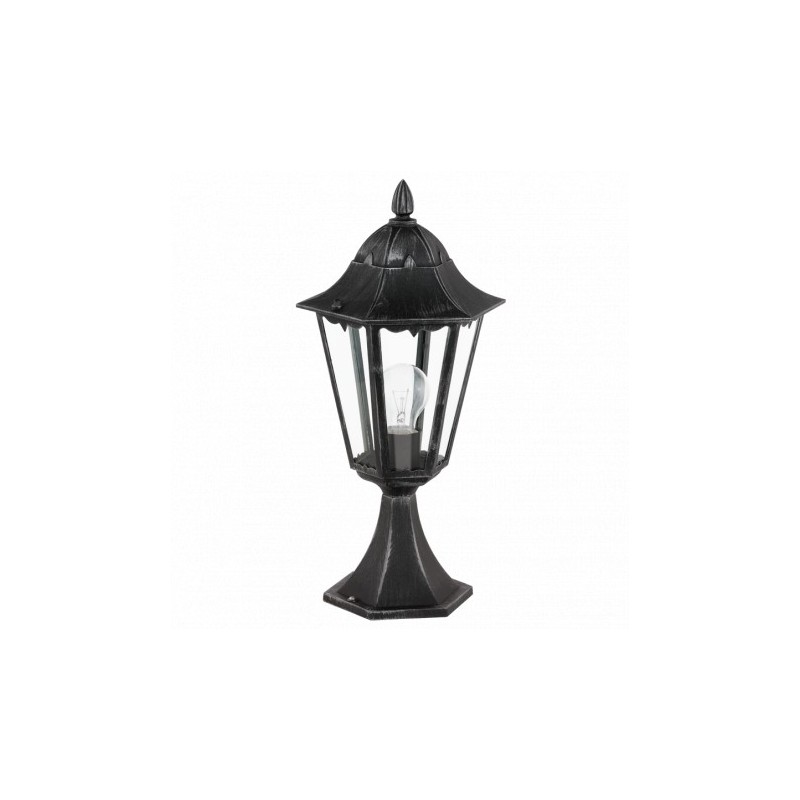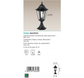 La lámpara de pie NAVEDO en diseño de farol está fabricada con un cuerpo de aluminio fundido patinado en negro y plata, que se combinó con cristales transparentes. La lámpara exterior es a prueba de salpicaduras (IP44) y se puede utilizar en exteriores con seguridad. Gracias a su diseño clásico, la lámpara de pie se adapta a una gran variedad de estilos en la zona exterior y ofrece una iluminación adecuada para chalets con construcción antigua o Art Nouveau, por ejemplo. La bombilla que se muestra no está incluida. La lámpara es apta para cualquier bombilla con casquillo E27