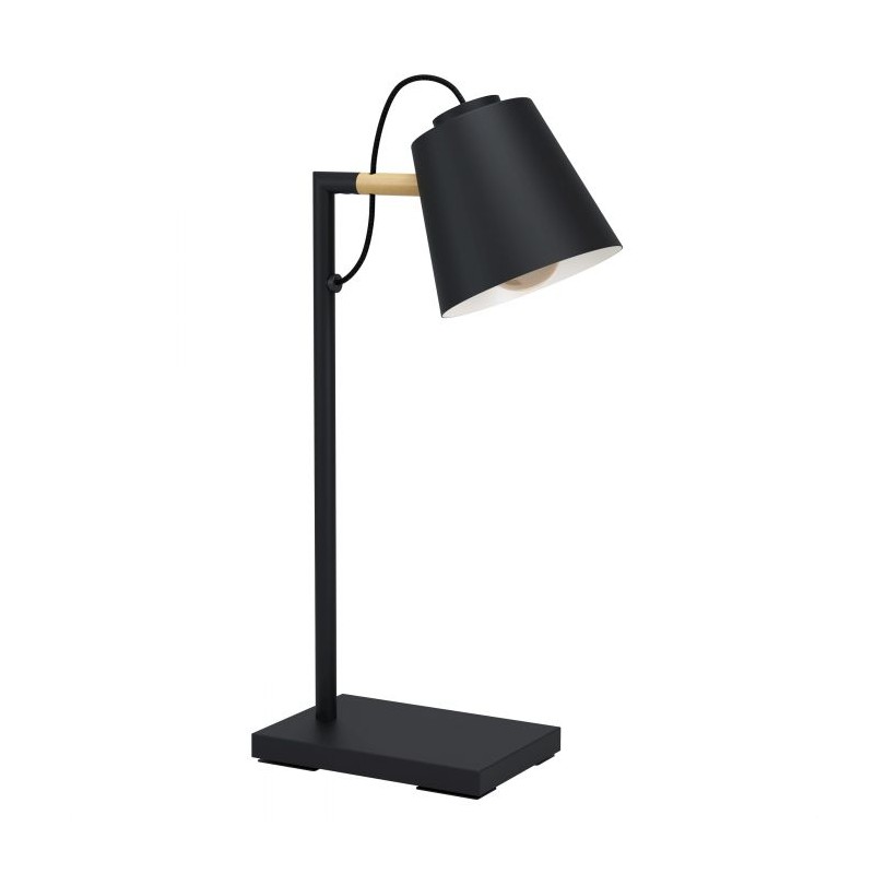 La lámpara de mesa LACEY está formada por una base de metal negra y una pantalla de metal negra con un interior de color crema. La lámpara se combina con elementos decorativos realizados en madera. Se puede utilizar el interruptor en el cable para encenderla y apagarla cómodamente. La lámpara de mesa de líneas rectas en el estilo New Nordic se puede integrar perfectamente en estilos de decoración modernos y ofrece una iluminación acogedora en el dormitorio, en la mesita de noche, en el salón o en el pasillo. La bombilla no está incluida. La lámpara es apta para cualquier bombilla con casquillo E27.