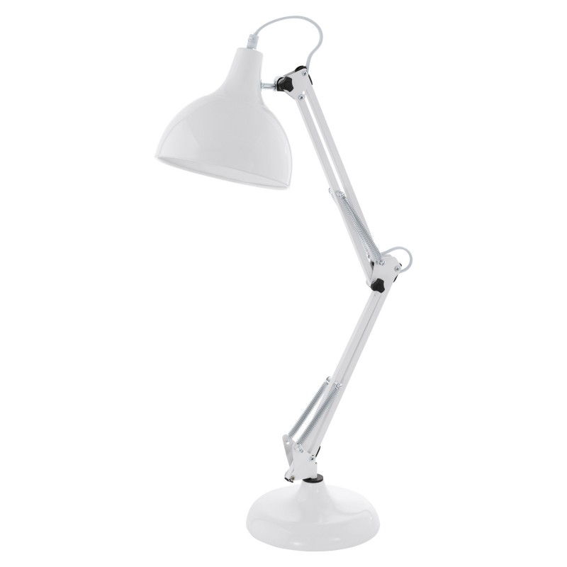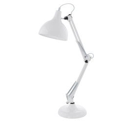• La lámpara de sobremesa BORGILLIO está realizada en metal blanco y tiene un cabezal móvil del mismo color. Las prácticas articulaciones en el cuerpo de la luminaria permiten ajustar la altura individualmente, de modo que se puede crear un área idealmente iluminada en la estancia con tan solo un movimiento. Se puede utilizar un interruptor en el cable para encenderla y apagarla cómodamente. La lámpara de sobremesa se adapta a la perfección en estilos de decoración modernos. La bombilla no está incluida. La lámpara es apta para cualquier bombilla con casquillo E27.