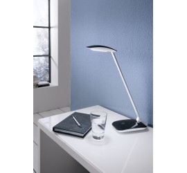 La lámpara de escritorio CAJERO LED tiene un cabezal y una base fabricados en plástico de color plateado con detalles en blanco. El brazo de la lámpara de color plateado y el cabezal se pueden girar y ajustar. El puerto USB integrado le permite cargar su smartphone. Los LED integrados emiten una luz blanca neutra y pueden encenderse y apagarse cómodamente, así como regularse gradualmente tocando el área "Touch me" que se encuentra en la base de la lámpara. Con su diseño minimalista|, la lámpara de escritorio encaja en ambientes modernos y proporciona una buena iluminación en su lugar de trabajo, ya sea en la oficina o en el escritorio del estudio en casa.