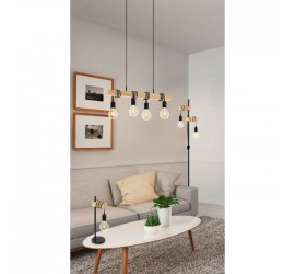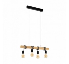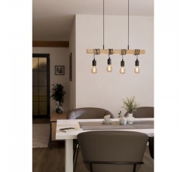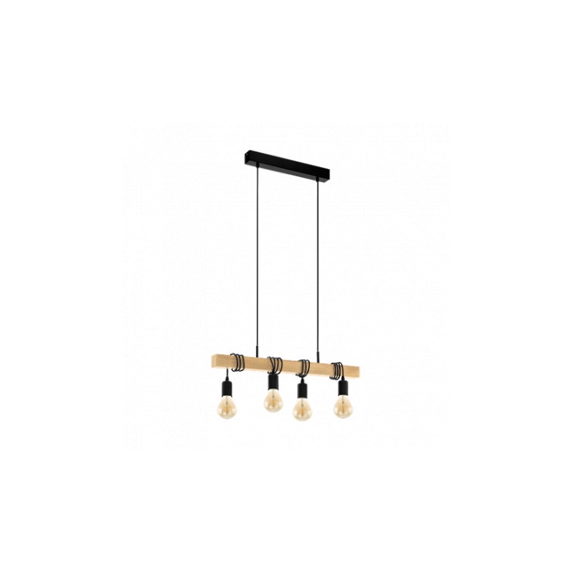 La lámpara colgante TOWNSHEND se compone de una viga de madera con cuatro portalámparas negros suspendidos. Las tulipas se pueden colgar a diferentes alturas simplemente enrollando el cable. La lámpara colgante con la emocionante mezcla de materiales de madera de pino y metal encaja a la perfección en tendencias como vintage e industrial. Proporciona una iluminación moderna para su estancia, ya sea en el salón o sobre una mesa del comedor alargada. Las bombillas de filamentos que se muestran no están incluidas. La lámpara es apta para cualquier bombilla con casquillo E27.