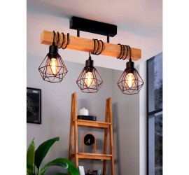 La lámpara de techo TOWNSHEND 5 está compuesta por una viga de madera y tres portalámparas negros suspendidos. Los marcos metálicos geométricos se pueden colgar a diferentes alturas gracias a un simple envoltorio. La lámpara de techo con la emocionante mezcla de materiales de madera de pino y metal encaja a la perfección en tendencias como vintage e industrial. Proporciona una iluminación moderna en cualquier estancia, ya sea en la cocina, el salón, el dormitorio, el pasillo o comedor. Las bombillas de filamentos que se muestran no están incluidas. La lámpara es apta para cualquier bombilla con casquillo E27.