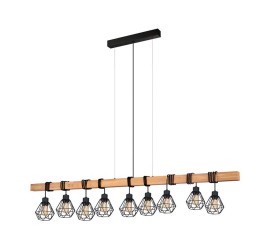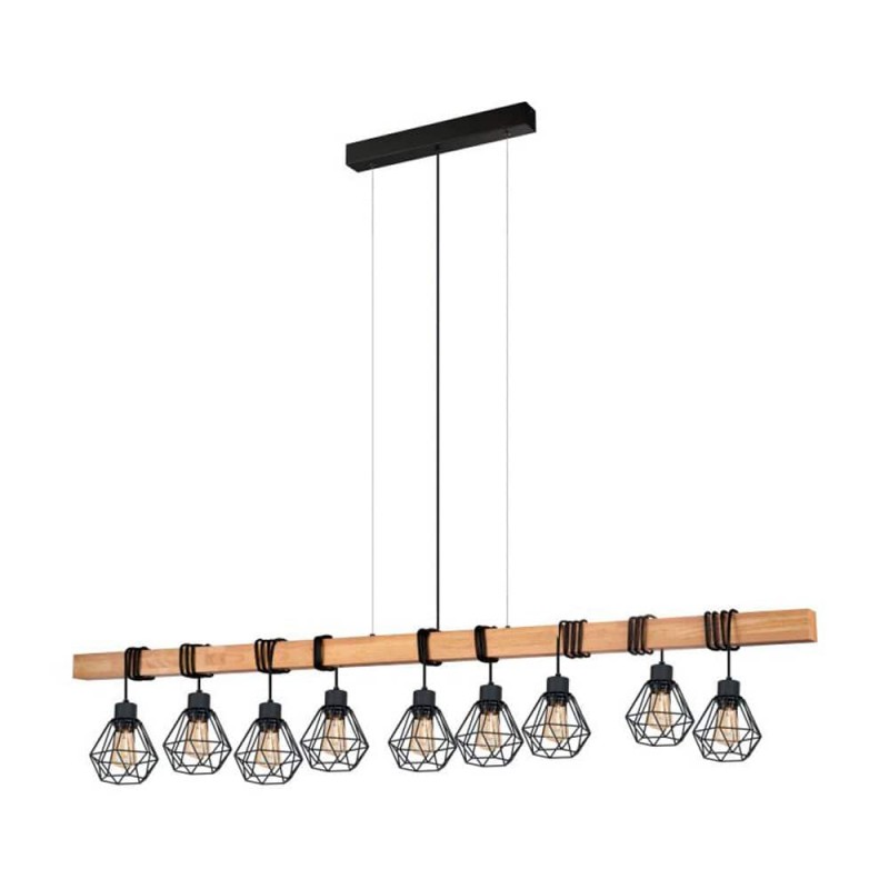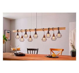 La lámpara colgante TOWNSHEND 5 está formada por una viga de madera y nueve pantallas suspendidas de alambre negro. Los marcos metálicos geométricos se pueden colgar a diferentes alturas gracias a un simple envoltorio. La lámpara colgante con la emocionante mezcla de materiales de madera de pino y metal encaja a la perfección en tendencias como vintage e industrial. Proporciona una iluminación moderna para su estancia, ya sea en el salón o sobre una mesa del comedor alargada. Las bombillas de filamentos que se muestran no están incluidas. La lámpara es apta para cualquier bombilla con casquillo E27.