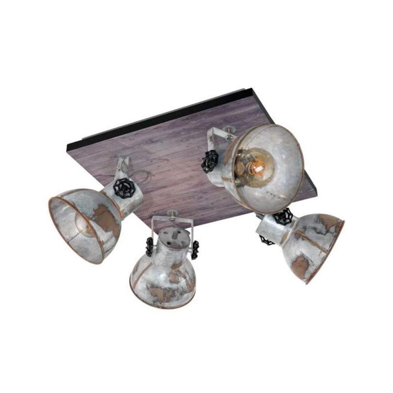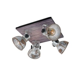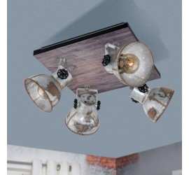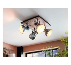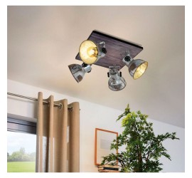El spot BARNSTAPLE está formado por un cuerpo de metal cuadrado con un elemento decorativo de madera marrón y una banda de metal circundante en negro. Los cuatro cabezales móviles de metal con aspecto galvanizado usado y los tornillos de bloqueo en negro en los laterales completan el diseño rústico de la lámpara. El spot encaja a la perfección en la tendencia industrial. El cabezal giratorio permite establecer puntos de iluminación individuales en la estancia, ya sea en la cocina, el salón, el dormitorio o el pasillo. Las bombillas de filamentos que se muestran no están incluidas. La lámpara es apta para cualquier bombilla con casquillo E27.