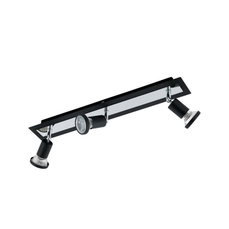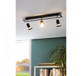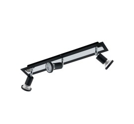 La lámpara LED de techo SARRIA está compuesta por un cuerpo rectangular de metal negro y tres cabezales móviles de metal negro. La lámpara de techo se combina con elementos metálicos en color cromo que completan a la perfección el diseño minimalista. Los cabezales giratorios permiten establecer puntos de iluminación en la estancia, ya sea en la cocina, el salón, el dormitorio o el pasillo. Las bombillas LED GU10 suministradas emiten una agradable luz cálida.