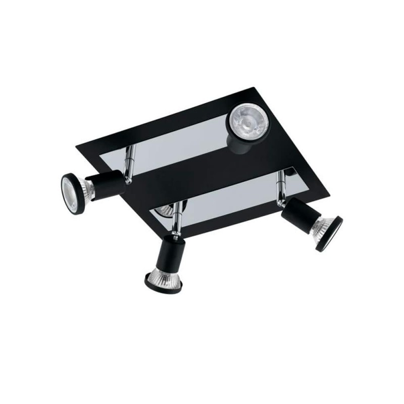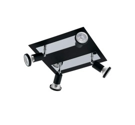 La lámpara LED de techo SARRIA está compuesta por un cuerpo rectangular de metal negro y cuatro cabezales móviles de metal negro. La lámpara de techo se combina con elementos metálicos en color cromo que completan a la perfección el diseño minimalista. Los cabezales giratorios permiten establecer puntos de iluminación en la estancia, ya sea en la cocina, el salón, el dormitorio o el pasillo. Las bombillas LED GU10 suministradas emiten una agradable luz cálida.