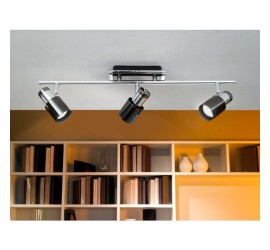La lámpara de techo LED DAVIDA está fabricada con un cuerpo de líneas rectas metálico en color níquel-nero y cromo combinado con tres cabezales móviles redondos. El spot de techo encaja perfectamente con el diseño moderno y le brinda la opción, gracias a los cabezales giratorios, de establecer puntos de iluminación individuales en la estancia, ya sea en la cocina, el salón, el dormitorio o el pasillo. Las bombillas LED GU10 están incluidas y emiten una agradable luz blanca cálida.
