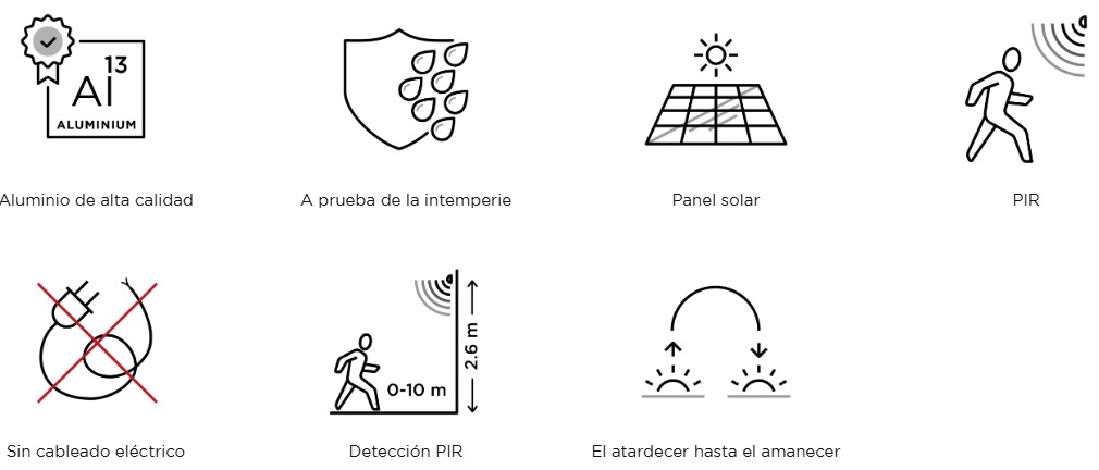 SOLAR: Panel monocristalino · 1W · Batería 1x Li-MnO2 3V 1500mAh